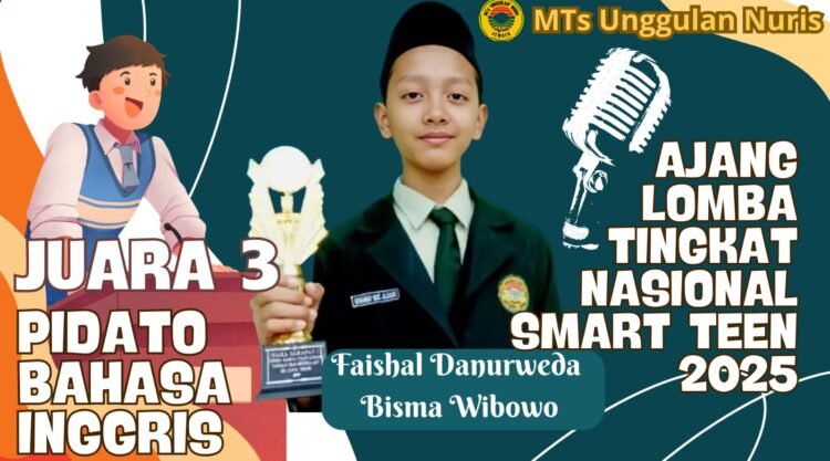 Pesantren Nuris – MTs Unggulan Nuris kembali mempertegas posisinya sebagai lembaga pendidikan Islam yang kompetitif di bidang bahasa. Prestasi terbaru datang dari Faishal Danurweda Bisma Wibowo, siswa kelas 9E, yang berhasil meraih Juara 3 dalam ajang Pidato Bahasa Inggris tingkat nasional. Kompetisi bertajuk “SMART TEENS 2025” ini diselenggarakan oleh SMA Al Furqan Jember dan diikuti oleh peserta berbakat dari berbagai sekolah di Indonesia.