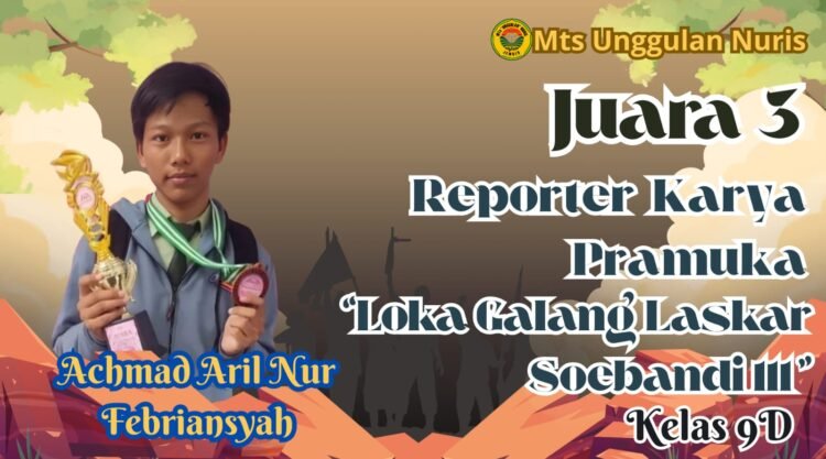 Achmad Aril Nur Febriansyah, seorang remaja berbakat yang kini menempuh pendidikan di kelas 9D MTs Unggulan Nuris, sukses mengukir prestasi gemilang. Aril berhasil meraih predikat Juara 3 Reporter Pramuka dalam ajang tingkat kabupaten tersebut, sebuah kategori yang menuntut kemampuan komunikasi dan kepercayaan diri tinggi di depan publik.