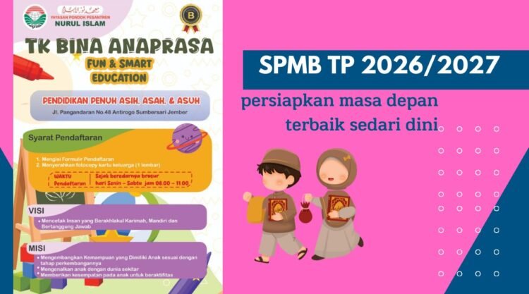 Pesantren Nuris – Meski tahun pelajaran 2026/2027 masih cukup jauh, tetapi persiapan untuk memberikan kesempatan anak-anak Anda pendidikan terbaik sejak usia dini harus betul-betul dilakukan dengan cermat. TK Bina Anparasa Nuris Jember jawabannya, mulai Januari 2026 ini sudah mulai membuka pendaftaran hingga Juni mendatang selama kuota masih tersedia.