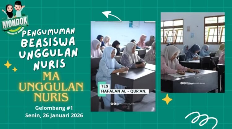 Pesantren Nuris – Pelaksanaan seleksi Beasiswa Unggulan Nuris tahun pelajaran 2026/2027 berjalan dengan lancar dan sukses pada Minggu, 25 Januari 2026 kemarin. Puluhan siswa yang duduk di kelas akhir baik dari tingkat SMP maupun MTs berjibaku meraih beasiswa pendidikan untuk masuk lembaga MA Unggulan Nuris. Berikut hasil pengumuman seleksi gelombang pertama tersebut baik melalui jalur sains berupa tes tulis, jalur kitab kuning hingga hafalan Al Qur’an.
