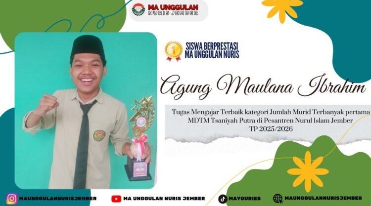 Pesantren Nuris — Agung Maulana Ibrahim, yang akrab disapa Agung, merupakan salah satu siswa berprestasi dari kelas XII Agama 1 MA Unggulan Nuris Jember. Siswa yang berasal dari Kejayan, Mayang, Jember ini dikenal sebagai pribadi yang tekun, cerdas, dan memiliki semangat tinggi dalam menuntut ilmu serta mengamalkannya dalam kehidupan sehari-hari. Dengan karakter yang disiplin dan penuh tanggung jawab, Agung berhasil menorehkan prestasi gemilang di bidang pendidikan pesantren.