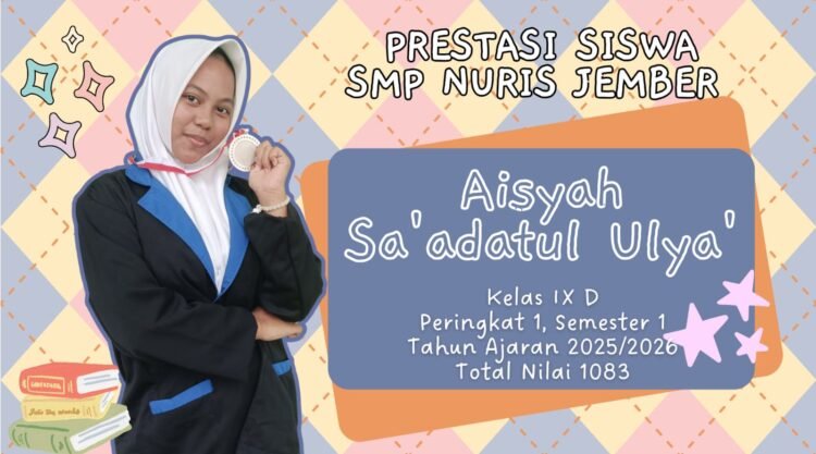 Pesantren Nuris — Prestasi membanggakan kembali hadir dari SMP Nuris Jember. Aisyah Sa’adatul Ulya’, siswi kelas IX D, berhasil meraih juara peringkat 3 dengan total nilai 1075 pada Semester 1 Tahun Ajaran 2025/2026. Capaian tersebut menjadi bukti nyata bahwa ketekunan, disiplin, dan manajemen waktu yang baik mampu mengantarkan seseorang menuju puncak keberhasilan.