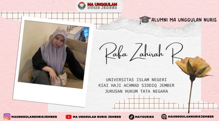 Pesantren Nuris — Setiap alumni memiliki perjalanan hidup yang unik dan penuh makna. Salah satu kisah inspiratif datang dari Rafa Zahirah R, alumni MA Unggulan Nuris tahun 2025, yang kini tengah melanjutkan pendidikan di Universitas Islam Negeri Kiai Haji Achmad Siddiq Jember pada jurusan Hukum Tata Negara. Dengan tekad kuat dan semangat belajar yang tinggi, Rafa terus melangkah menuju cita-citanya menjadi seorang notaris profesional di masa depan.