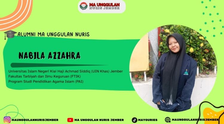 Pesantren Nuris — Nabila Azzahra menjadi salah satu alumni MA Unggulan Nuris tahun 2025 yang patut dibanggakan. Perempuan kelahiran Jember tahun 2006 ini berasal dari Kecamatan Arjasa, Kabupaten Jember. Sejak menempuh pendidikan di SMP Nuris hingga melanjutkan ke MA Unggulan Nuris, Nabila dikenal sebagai sosok yang tekun, sederhana, serta memiliki semangat belajar yang tinggi.