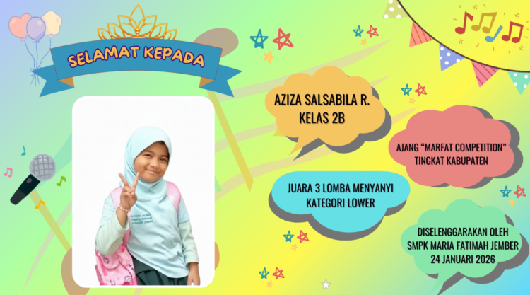 Terima kasih, Aziza Salsabila Ramadani! Terima kasih telah menyumbangkan nada terindah untuk madrasah ini. Langkahmu mungkin telah berpindah, namun namamu telah tercatat manis sebagai salah satu penyanyi cilik kebanggaan kami. Selamat mengukir cerita baru di sekolahmu yang sekarang, teruslah bernyanyi, dan kepakkan sayapmu setinggi mungkin! Semoga cita-citamu bisa kau capai, di manapun kakimu melangkah. Barakallah, Nak! Do’a kami semua akan selalu menyertaimu. [FE.Red]