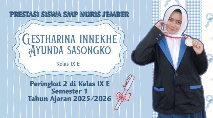 Pesantren Nuris — Prestasi membanggakan kembali ditorehkan oleh siswa SMP Nuris Jember. Kali ini, sorotan prestasi datang dari Gestharina Innekhe Ayunda Sasongko, berhasil meraih juara peringkat 2 Semester 1 Tahun Ajaran 2025/2026 di kelas IX E. Capaian ini menjadi bukti nyata bahwa ketekunan dan kedisiplinan mampu mengalahkan lelah dan keterbatasan waktu.