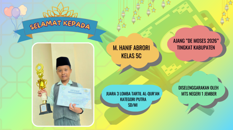 Hanya berselang dua pekan dari kemenangan sebelumnya, Hanif sukses meraih Juara 3 Tartil Al-Qur’an dalam ajang bergengsi yang bernama De MOSES 2026. Kompetisi yang mempertemukan bakat-bakat Islami terbaik ini diselenggarakan oleh MTsN 1 Jember tepat pada hari Sabtu, 14 Februari 2026.