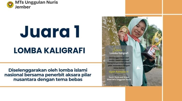 Pesantren Nuris – Prestasi gemilang kembali ditorehkan oleh salah satu siswi MTs. Isyah Kamalia H., siswi kelas VII D asal Arjasa, berhasil meraih juara 1 dalam ajang Lomba Kaligrafi pada Lomba Islami Nasional yang diselenggarakan bekerja sama dengan Penerbit Aksara Pilar Nusantara dengan tema bebas. Keberhasilan ini menjadi bukti nyata atas bakat dan kemampuan Isyah dalam bidang seni kaligrafi Islami. Melalui karya yang ditampilkan, Isyah mampu memadukan keindahan goresan, ketepatan kaidah penulisan, serta kreativitas artistik yang menarik perhatian dewan juri.