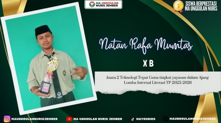 Natan Rafa Mumtas menjadi inspirasi bagi seluruh siswa MA Unggulan Nuris Jember untuk terus berjuang, berinovasi, dan percaya pada kemampuan diri sendiri. Bahwa setiap prestasi lahir dari proses panjang yang penuh tantangan, kesabaran, dan kerja keras.