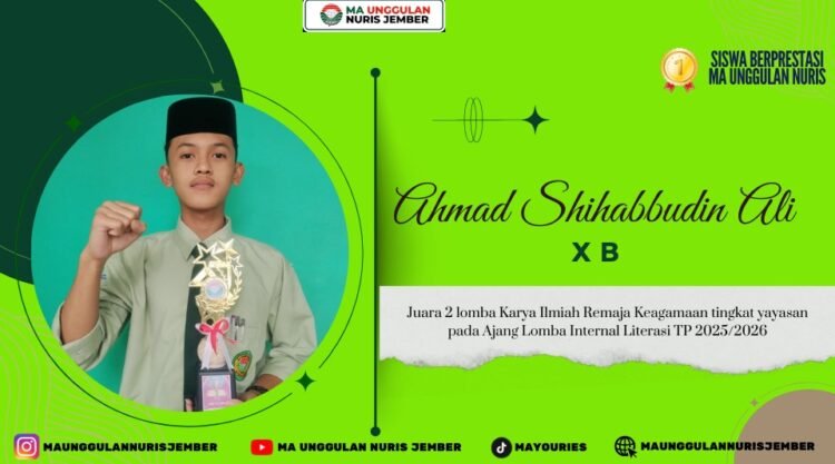 Pesantren Nuris — Ahmad Shihabbudin Ali, yang akrab disapa Shihab, merupakan salah satu siswa berprestasi dari kelas X B di MA Unggulan Nuris Jember. Berasal dari Kesilir, Wuluhan, Jember, Shihab dikenal sebagai pribadi yang tekun, rajin, dan memiliki kecintaan tinggi terhadap dunia literasi. Sejak awal menempuh pendidikan di madrasah, ia telah menunjukkan minat besar dalam membaca, menulis, dan mengembangkan kemampuan berpikir kritis.