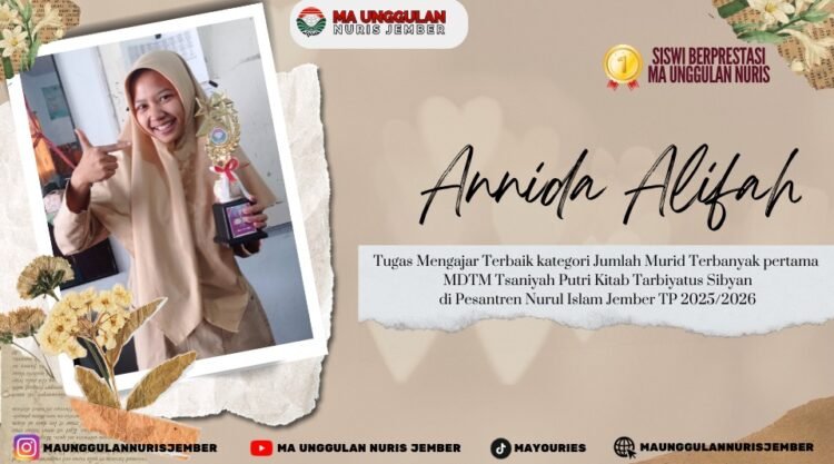 Pesantren Nuris — Annida Alifah, yang akrab disapa Nida, merupakan salah satu siswi berprestasi dari kelas XI C MA Unggulan Nuris Jember. Siswi yang tinggal di Jalan Srikoyo, Patrang, Jember ini dikenal sebagai pribadi yang rendah hati, rajin, dan memiliki semangat tinggi dalam menuntut ilmu. Dengan tekad yang kuat dan sikap pantang menyerah, Nida berhasil menorehkan prestasi membanggakan di bidang pendidikan pesantren.