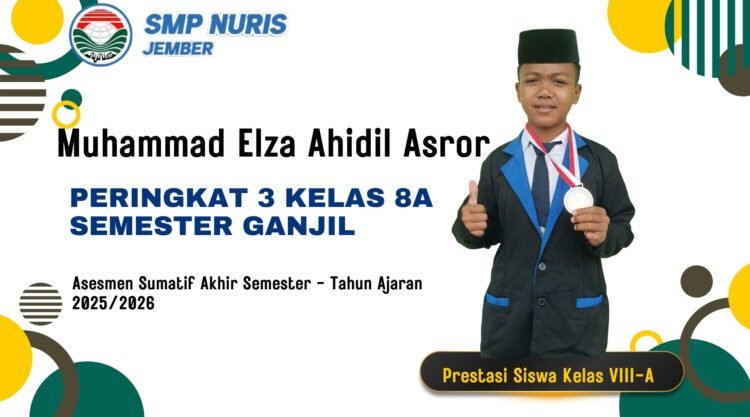Pesantren Nuris – Prestasi membanggakan kembali ditorehkan siswa SMP Nuris Jember melalui Muhammad Elza Ahidil Asror. Siswa kelas VIII-A ini berhasil meraih peringkat 3 pada ASAS Semester Ganjil Tahun Ajaran 2025/2026. Capaian tersebut menunjukkan konsistensi belajar yang terus meningkat dari waktu ke waktu. “Saya sangat bangga karena bisa menjadi lebih baik,” ujar Elza.