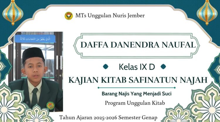 Pesantren Nuris – MTs Unggulan Nuris Jember kembali menyelenggarakan kegiatan pembelajaran berbasis kitab turats melalui program unggulan kajian kitab. Kali ini, kegiatan menghadirkan kajian dari Safinatun Najah dengan tema Barang Najis yang Menjadi Suci, yang disampaikan oleh siswa kelas IX D, Daffa Danendra Naufal, sebagai bagian dari penguatan pemahaman fikih praktis dalam kehidupan sehari-hari.