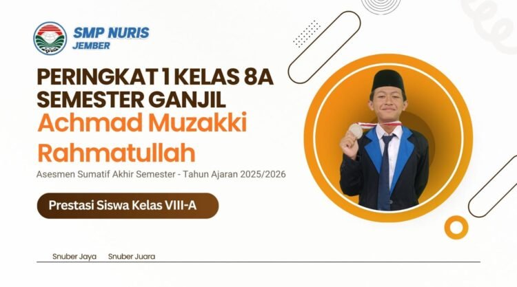 Pesantren Nuris – Prestasi gemilang ditorehkan oleh siswa SMP Nuris Jember pada pelaksanaan ASAS Semester Ganjil Tahun Ajaran 2025/2026. Achmad Muzakki Rahmatullah, siswa kelas VIII A, berhasil meraih peringkat 1 dan menempatkan namanya di posisi teratas. Capaian ini menjadi bukti peningkatan kualitas belajar yang konsisten. “Saya bangga sama diri sendiri karena bisa jadi lebih baik dari yang sebelumnya,” ujar Muzakki.