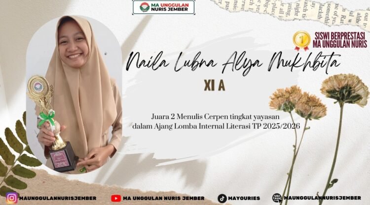 Pesantren Nuris — Naila Lubna Alya Mukhbita, yang akrab disapa Naila atau Lubna, merupakan salah satu siswi berprestasi dari kelas XI A di MA Unggulan Nuris Jember. Siswi yang berasal dari wilayah Puger, Jember ini dikenal sebagai pribadi yang tekun, gemar membaca, serta memiliki minat besar dalam dunia kepenulisan dan literasi.