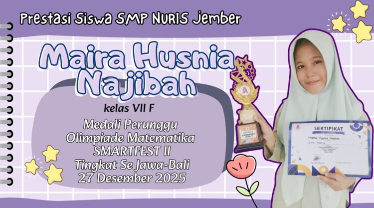 Pesantren Nuris — Prestasi membanggakan kembali ditorehkan oleh siswa SMP Nuris Jember. Kali ini, sorotan tertuju pada sosok siswi kelas VII F, Maira Husnia Najibah, yang berhasil meraih medali perunggu Olimpiade Matematika dalam ajang SMARTFEST II tingkat Se Jawa–Bali. Kompetisi bergengsi tersebut diselenggarakan oleh Mitra Usaha dan berlangsung di Gedung FKIP Universitas Jember (UNEJ) pada 27 Desember 2025.
