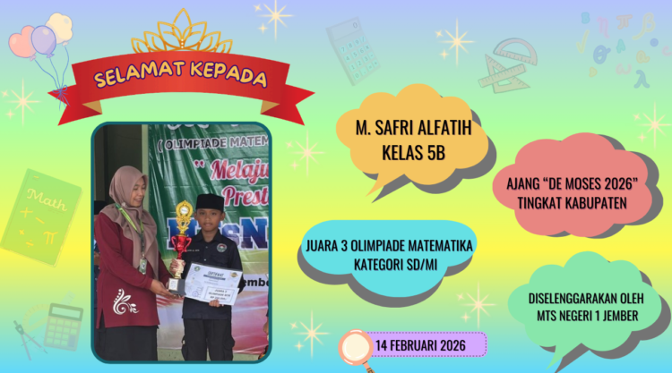 Siswa cerdas dari kelas 5-B ini sukses menembus ketatnya persaingan dengan meraih Juara 3 Olimpiade Matematika Kategori SD/MI. Prestasi gemilang ini ia torehkan dalam kompetisi tingkat Kabupaten yang diselenggarakan oleh MTs Negeri 1 Jember pada tanggal 14 Februari 2026.