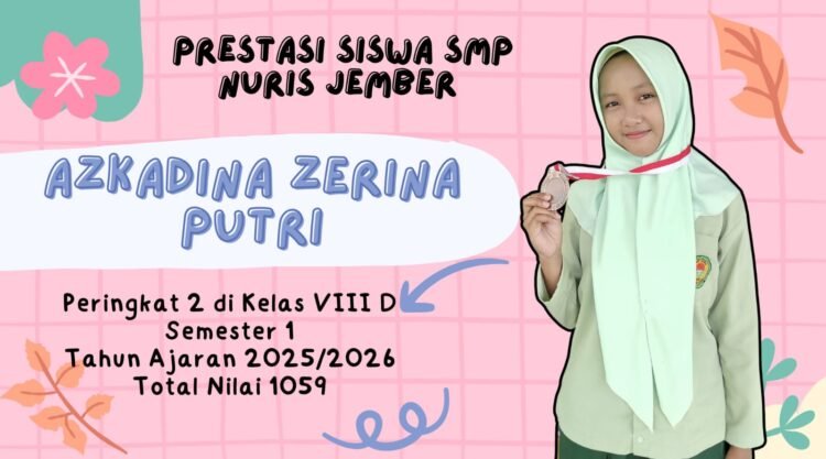 Pesantren Nuris — Di antara derap langkah para pelajar yang menjemput mimpi setiap pagi, ada satu sosok yang berjalan dengan tenang namun penuh keyakinan. Seakan fajar tak hanya membawa cahaya mentari, tetapi juga semangat yang menyala di dada Azkadina Zerina Putri. Siswi kelas VIII D di SMP Nuris Jember ini menorehkan prestasi membanggakan dengan meraih juara peringkat 2 di kelasnya pada Semester 1 Tahun Ajaran 2025/2026, dengan total nilai fantastis 1059.