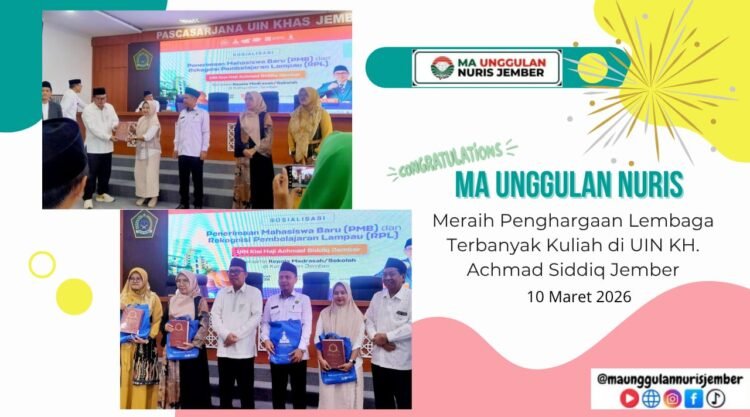 Pesantren Nuris – MA Unggulan Nuris kembali mengulang kegemilangan tahun 2025 di tahun 2026 ini dengan cemerlang usai berhasil meraih apresiasi dan penghargaan prestisius secara kelembagaan. Pasalnya, pada 10 Maret 2026 kemarin, lembaga yang dipimpin oleh Ning Balqis Al Humairo tersebut dinyatakan sebagai lembaga yang dinyatakan paling banyak diterima dan mendaftar ulang di UIN KH. Achmad Siddiq (KHAS) Jember.