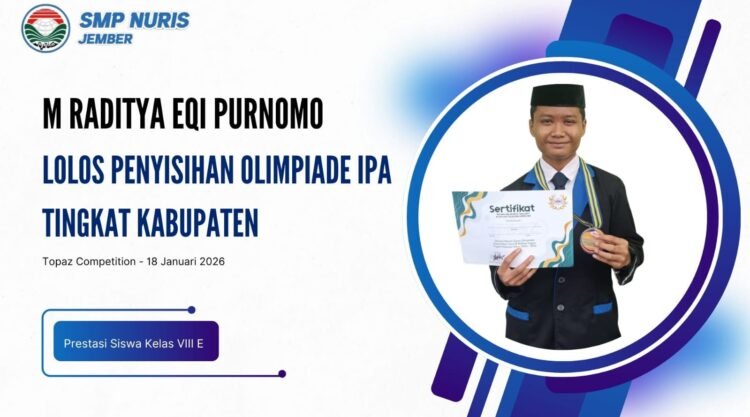 Pesantren Nuris – SMP Nuris Jember kembali mencatatkan capaian membanggakan melalui kiprah siswanya di ajang akademik. Kali ini, M Raditya Eqi Purnomo berhasil lolos penyisihan Olimpiade IPA tingkat kabupaten yang diselenggarakan oleh Topaz Global Education. Kompetisi tersebut berlangsung pada 18 Januari 2026 di SDN Kepatihan 03. “Saya ingin menguasai lebih dari satu bidang, tidak hanya IPS tapi juga IPA,” ujarnya. Pencapaian ini menjadi bukti bahwa keberanian mencoba hal baru dapat membuka peluang prestasi.