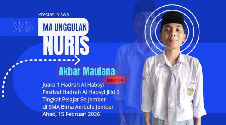 Pesantren Nuris – Di balik kesuksesan Ashabul Muhyi, tim hadrah Pesantren Nuris Jember, meraih juara 1 Festival Hadrah Al Habsyi Jilid 2 tingkat pelajar se-Kabupaten Jember di SMA Bima Ambulu Jember pada 15 Februari 2026 lalu, ada peran M. Akbar Maulana sebagai salah satu vokalis andal di dalamnya.