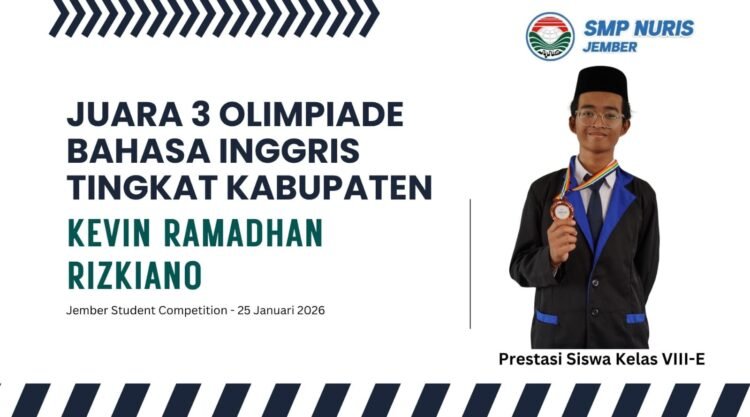 Pesantren Nuris – SMP Nuris Jember kembali menorehkan prestasi melalui ajang Jember Student Competition yang digelar pada 25 Januari 2026 di Aula Pemkab Jember. Kevin Ramadhan Rizkiano berhasil meraih juara 3 pada bidang Bahasa Inggris tingkat kabupaten. Kompetisi ini diselenggarakan oleh Mitra Prestasi bekerja sama dengan Pemkab Jember. “Saya merasa senang bisa meraih juara di lomba ini,” ujarnya. Hasil ini menjadi bukti nyata dari usaha dan konsistensi yang dilakukan selama persiapan.
