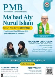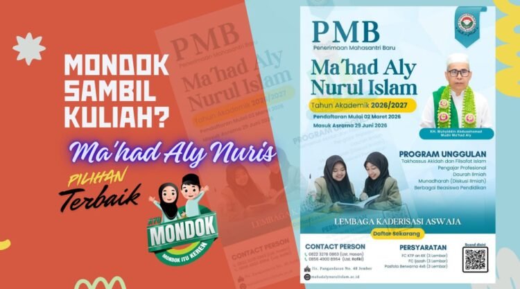 Pengumuman pendaftaran Ma’had Aly Nurul Islam Jember telah dibuka sejak 02 Maret 2026 kemarin. Jika calon mahasantri belum banyak mengetahui informasinya, jangan khawatir, silakan cek informasinya dan ikuti perkembangannya di laman website pesantrennuris.net atau https://www.mahadalynurulislam.ac.id/ dan media sosial IG Ma’had Aly Nuris Jember atau kontak personal 0823 0198 5430 (ustaz Rofiki); 0822 3278 0863 (Ustaz Hasan).