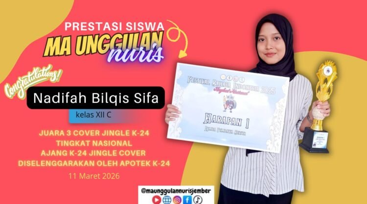 Pesantren Nuris – Nadifah Bilqis Sifa bukan santriwati biasa. Pasalnya, berbagai talenta berhasil ia kembangkan di Pesantren Nuris Jember, khususnya di MA Unggulan Nuris, hingga menorehkan tinta emas prestasi gemilang di kancah nasional. Tak hanya di bidang fotografi dan news anchor, kali ini ia berhasil menggondol piala K-24 Cover Jingle pada 11 Maret 2026 kemarin. Keren banget bukan?