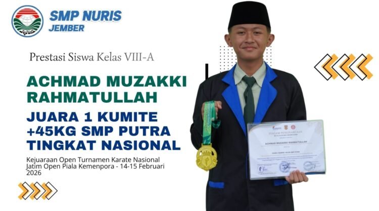 Pesantren Nuris – Prestasi membanggakan kembali ditorehkan siswa SMP Nuris Jember di tingkat nasional. Achmad Muzakki Rahmatullah berhasil meraih juara 1 pada cabang Kumite +45 Kg SMP Putra dalam Kejuaraan Open Turnamen Karate Nasional Jatim Open Piala Kemenpora. “Saya sangat senang bisa meraih juara satu di kejuaraan ini,” ungkapnya.