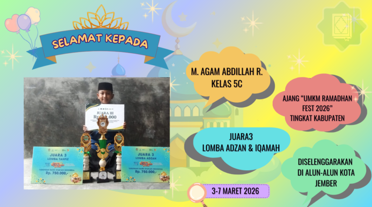Kali ini, kabar gembira itu dibawakan dari sosok siswa dari kelas 5C yang bernama M. Agam Abdillah R., atau yang akrab disapa Agam. Berbeda dengan hingar-bingar kompetisi cerdas cermat atau olimpiade sains sebelumnya, Agam tampil menyejukkan hati lewat lantunan suaranya. Ia berhasil menorehkan prestasi gemilang dengan meraih Juara 3 Lomba Adzan tingkat kabupaten.