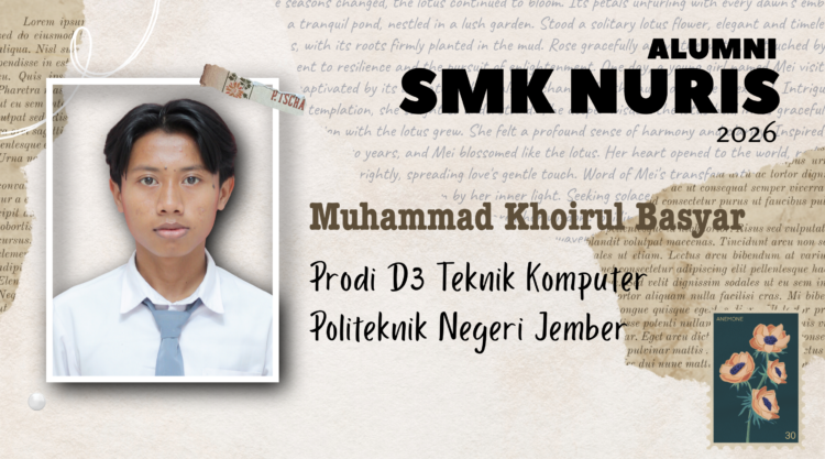 Pesantren Nuris – Langkah pasti menuju masa depan di bidang teknologi berhasil diraih Muhammad Khoirul Basyar, alumni SMK Nuris Jember tahun 2026. Siswa kelas XII jurusan Teknik Komputer dan Jaringan (TKJ) ini sukses menembus Seleksi Nasional Berdasarkan Prestasi (SNBP) dan diterima di Program Studi D3 Teknik Komputer, Politeknik Negeri Jember.
