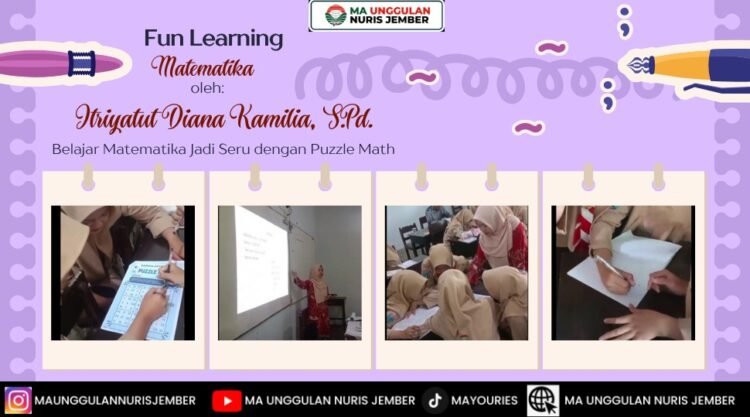 Pesantren Nuris — Pembelajaran matematika di kelas XE MA Unggulan Nuris Jember berlangsung dengan suasana yang berbeda dan penuh semangat. Itriyatut Diana Kamilia, S.Pd., selaku guru mata pelajaran Matematika, menghadirkan konsep fun learning melalui model Problem Based Learning (PBL) pada materi Barisan Aritmetika.