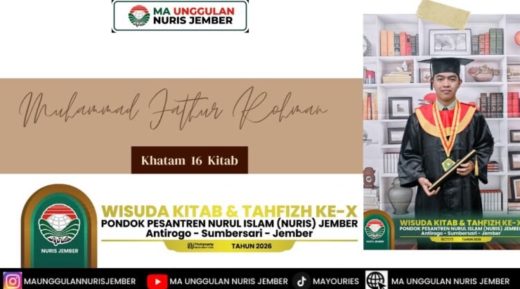 Pesantren Nuris — Prestasi membanggakan kembali lahir dari lingkungan MA Unggulan Nuris Jember. Seorang siswa kelas XII A bernama Muhammad Fathur Rohman sukses menorehkan capaian luar biasa dengan mengkhatamkan 16 kitab selama menempuh pendidikan di pondok pesantren Nurul Islam Jember. Tidak hanya unggul dalam bidang keilmuan agama, siswa yang akrab disapa Fathur ini juga dikenal sebagai sosok berprestasi di berbagai ajang perlombaan tingkat kabupaten hingga nasional.