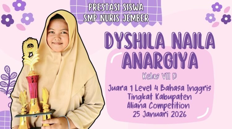 Pesantren Nuris — Prestasi gemilang kembali ditorehkan oleh siswi SMP Nuris Jember. Dyshila Naila Anargiya, siswa kelas VII D, berhasil meraih juara 1 bidang Matematika level 4 dalam ajang Aliana Competition tingkat kabupaten yang diselenggarakan oleh Aliana Production. Kompetisi tersebut berlangsung meriah di Lippo Plaza Jember pada 25 Januari 2026, menghadirkan puluhan peserta terbaik dari berbagai sekolah yang siap bersaing dalam adu kemampuan.