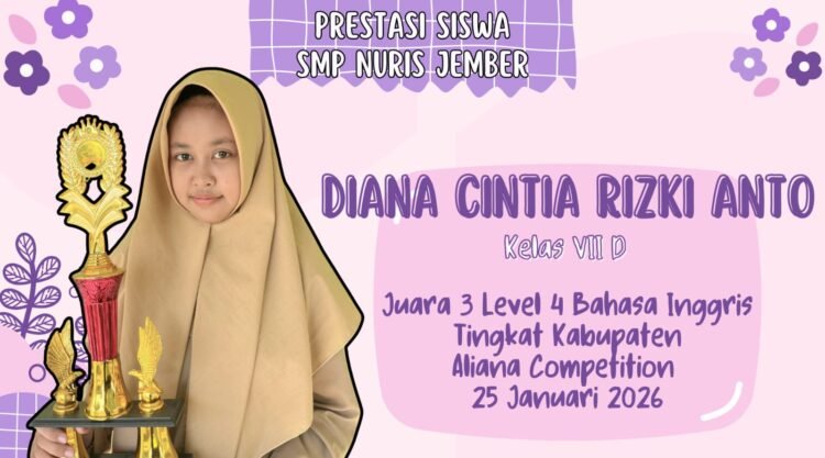 Pesantren Nuris — Riuh rendah suasana Lippo Plaza Jember hari ini menjadi saksi bisu sebuah perjuangan intelektual yang sengit. Di tengah kepungan puluhan peserta dari berbagai penjuru kabupaten, Diana Cintia Rizki Anto, siswi kelas VII D SMP Nuris Jember, berhasil memahat prestasi gemilang. Ia sukses mengamankan podium ketiga bidang Matematika Level 4 dalam ajang bergengsi Aliana Competition yang diselenggarakan oleh Aliana Production.