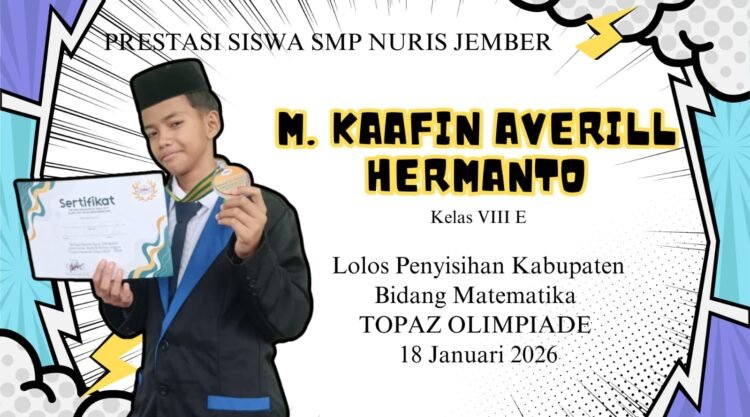 Pesantren Nuris — Dunia pendidikan di Kabupaten Jember kembali dibuat berdecak kagum. Bak meteor yang membelah kegelapan malam, M. Kaafin Averill Hermanto, siswa kelas VIII E SMP Nuris Jember, berhasil menorehkan tinta emas dalam ajang bergengsi TOPAZ Olimpiade Tingkat Nasional. Melalui persaingan yang menguras otak di babak penyisihan kabupaten yang digelar di SDN Kepatihan 3 Jember pada 18 Januari 2026 lalu, Kaafin resmi dinyatakan lolos untuk melaju ke babak Final Provinsi yang akan dihelat di Universitas Negeri Surabaya (UNESA).