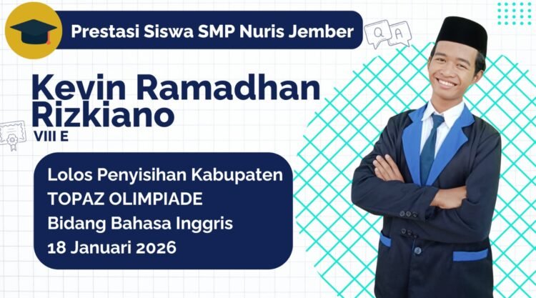Pesantren Nuris — Kilau prestasi kembali terpancar dari SMP Nuris Jember. Seolah menembus batas langit, seorang siswi berbakat bernama Kevin Ramadhan Rizkiano dari kelas VIII E berhasil menunjukkan kemampuan terbaiknya di bidang Bahasa Inggris. Ia sukses lolos seleksi babak penyisihan tingkat kabupaten dalam ajang TOPAZ Olimpiade tingkat Nasional yang digelar di SDN Kepatihan 3 Jember pada 18 Januari 2026.