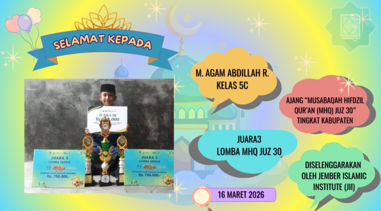 Ya, bocah bersuara merdu ini kembali menorehkan tintas emas untuk MI Unggulan Nuris Jember. Melengkapi dua piala sebelumnya, Agam sukses mengamankan posisi Juara 3 dalam ajang Musabaqah Hifdzil Qur’an (MHQ) Juz 30 Tingkat Kabupaten. Sebuah pencapaian yang membuat bulan Maret 2026 ini resmi menjadi bulan keemasan bagi seorang Agam.