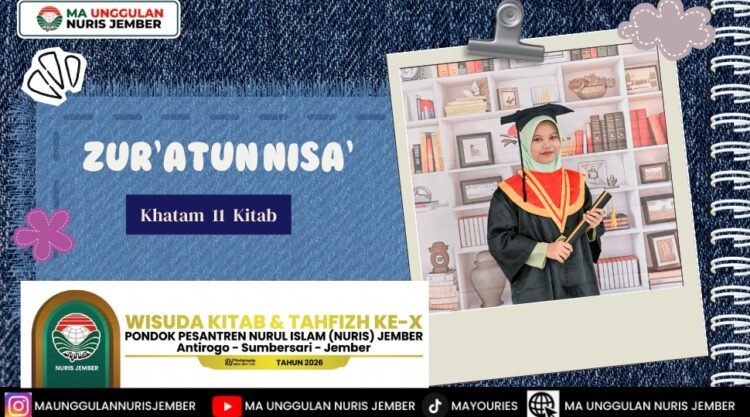 Pesantren Nuris — Prestasi membanggakan kembali hadir dari keluarga besar MA Unggulan Nuris Jember. Salah satu siswi kelas XII C, Zur’atun Nisa’, berhasil menorehkan capaian istimewa dengan sukses mengkhatamkan 11 kitab selama menempuh pendidikan di pesantren. Tidak hanya itu, siswi yang akrab disapa Ninis ini juga dikenal sebagai pelajar berprestasi di bidang hafalan dan musabaqah keilmuan.