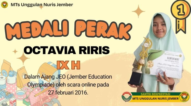 Pesantren Nuris – Prestasi membanggakan kembali ditorehkan oleh siswa MTs Unggulan Nuris Jember. Salah satu siswi berprestasi, Octavia Riris dari kelas IX H, berhasil meraih medali perak dalam Olimpiade IPA pada ajang Jember Education Olympiade (JEO) yang diselenggarakan secara online pada 27 Februari. Keberhasilan ini menjadi bukti nyata bahwa siswa MTs Unggulan Nuris mampu bersaing dan menunjukkan kualitas akademik di tengah kompetisi yang cukup ketat.
