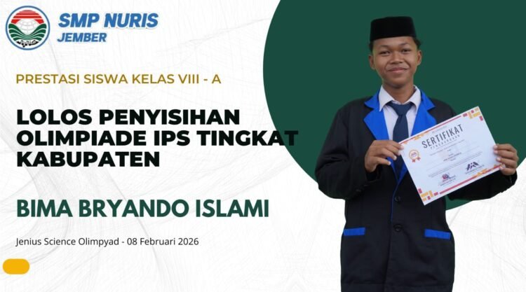 Pesantren Nuris – Upaya pembuktian kemampuan siswa kembali terlihat dari capaian di ajang akademik tingkat kabupaten. Bima Bryando Islami, siswa SMP Nuris Jember, berhasil lolos babak penyisihan dalam kompetisi JSO bidang IPS yang diselenggarakan oleh Intan Mulia. Lomba tersebut berlangsung pada 8 Februari 2026 di SD Al Baitul Amien Jember. Hasil ini menunjukkan kesiapan siswa dalam menghadapi persaingan berbasis pengetahuan sosial.
