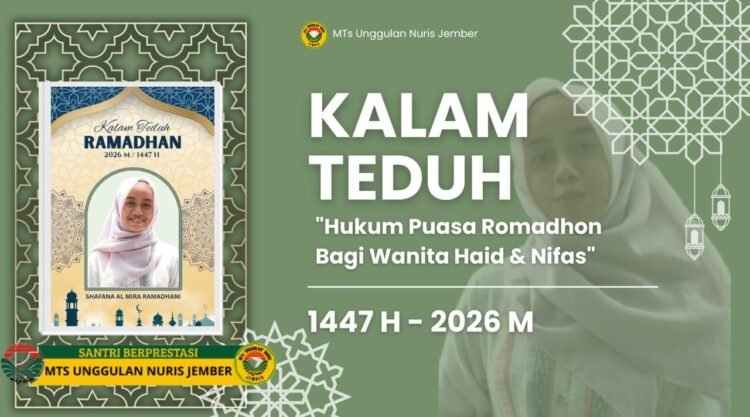 Pesantren Nuris – Dalam rangka memperkuat wawasan keislaman siswa selama bulan suci, MTs Unggulan Nuris Jember kembali melaksanakan program Kalam Teduh Ramadhan 1447 H/2026 M. Pada sesi kali ini, materi disampaikan oleh Shafana Al Mira Ramadhani dengan tema “Hukum Puasa bagi Wanita Haid dan Nifas”. Kegiatan ini menjadi sarana edukasi penting bagi siswa dalam memahami hukum-hukum fiqih yang berkaitan dengan ibadah puasa.