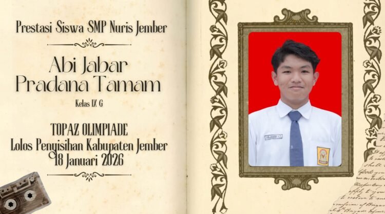 Pesantren Nuris — Semangat belajar yang membara seperti api tak pernah padam mengantarkan Abijabar Pradana Tamam, siswi kelas IX G SMP Nuris Jember, menorehkan prestasi membanggakan. Ia berhasil lolos seleksi babak penyisihan tingkat kabupaten dalam bidang Bahasa Inggris pada ajang TOPAZ Olimpiade tingkat Nasional yang digelar di SDN Kepatihan 3 Jember pada 18 Januari 2026. Kompetisi yang diselenggarakan oleh Topaz Global Education ini menjadi gerbang awal bagi Abi untuk melangkah menuju babak final provinsi yang akan berlangsung di Universitas Negeri Surabaya (UNESA).