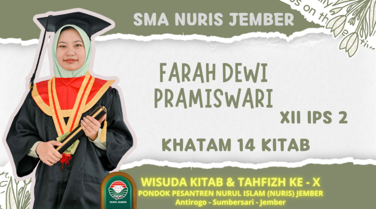 Keberhasilan Farah Dewi Pramiswari dalam Wisuda Kitab dan Tahfizh Ke-X ini menjadi bukti nyata bahwa kedisiplinan dan tidak ragu bertanya jika tidak paham materi bisa mengalahkan semua tantangan dan bisa mencapai keberhasilan. Semoga perjalanan Farah mampu memotivasi para pelajar lainnya untuk terus berjuang menuntut ilmu, berani bermimpi besar, dan yakin bahwa setiap proses yang dijalani dengan sabar dan rajin pasti akan terbayar indah pada saatnya nanti. [ANF. Red]
