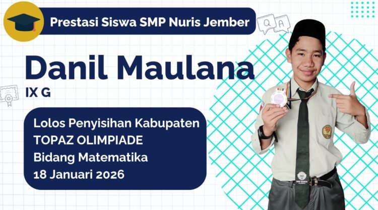 Pesantren Nuris — Deretan angka yang bagi sebagian orang terasa rumit, justru menjadi sahabat akrab bagi Danil Maulana. Siswa kelas IX G SMP Nuris Jember ini berhasil membuktikan bahwa kecintaan terhadap Matematika mampu mengantarkannya menuju prestasi membanggakan. Ia sukses lolos seleksi babak penyisihan tingkat kabupaten dalam ajang TOPAZ Olimpiade tingkat Nasional bidang Matematika yang dilaksanakan di SDN Kepatihan 3 Jember pada 18 Januari 2026.