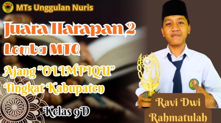 Pesantren Nuris – Dunia seni baca Al-Qur’an di tingkat kabupaten kembali melahirkan talenta muda yang menjanjikan. Kali ini, nama Ravi Dwi Rahmatullah, siswa kelas 9D dari MTs Unggulan Nuris, berhasil mencatatkan namanya dalam deretan pemenang ajang bergengsi OLIMPIQU 2026. Ravi sukses meraih gelar Juara Harapan 2 dalam kategori Lomba Musabaqah Tilawatil Qur’an Putra.
