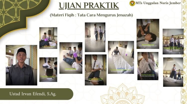 Pesantren Nuris – Suasana khidmat sekaligus penuh keseriusan tampak di lingkungan MTs Unggulan Nuris Jember saat pelaksanaan ujian praktik mata pelajaran Fiqih. Para siswa mengikuti kegiatan praktik dengan materi “Tata Cara Mengurus Jenazah” sebagai bagian dari implementasi pembelajaran yang aplikatif dan bermakna. Kegiatan ini dibimbing langsung oleh Irvan Efendi, S.Ag., yang dikenal tegas namun penuh perhatian dalam membimbing siswa memahami materi keagamaan. Dengan pendekatan praktik langsung, siswa diajak untuk tidak hanya memahami teori, tetapi juga mampu mengaplikasikan tata cara pengurusan jenazah sesuai syariat Islam.