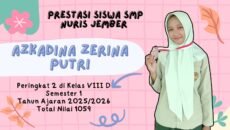 Prestasi06/03/2026 Azkadina Zerina Putri, Permata SMP Nuris Jember yang Berkilau sebagai Juara 2 Kelas VIII D Selangkah Lebih Maju Sejak Fajar Ilmu Menyingsing, Azkadina Membuktikan Kecerdasan … Share